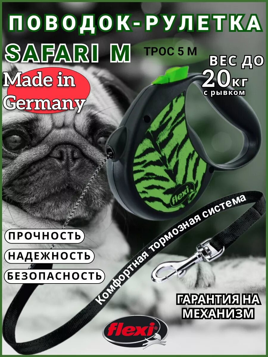 Рулетка для собак Flexi Safari Tiger трос, зеленая M 5м/20кг