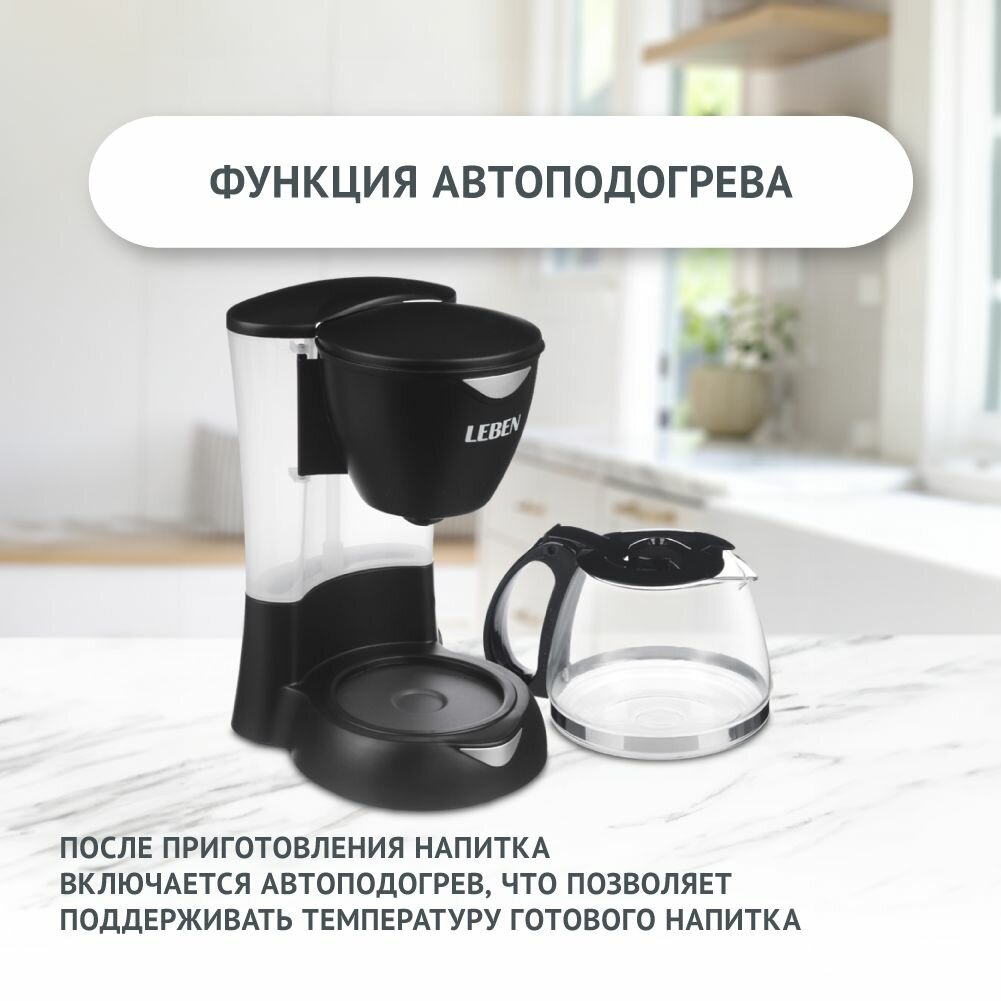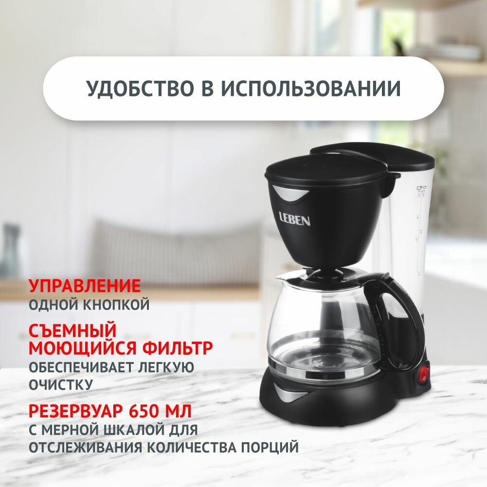LEBEN Кофеварка капельная 550Вт, стеклянная колба 0,6л интересное: