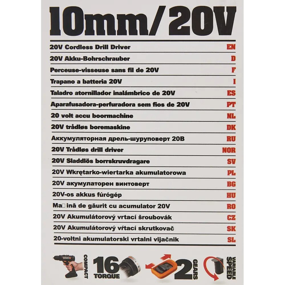 WORX Дрель-шуруповерт аккумуляторная WX101.1, 30Нм, 20В, АКБ x2 1,5Ач, ЗУ 0,4А, кейс WX101.1