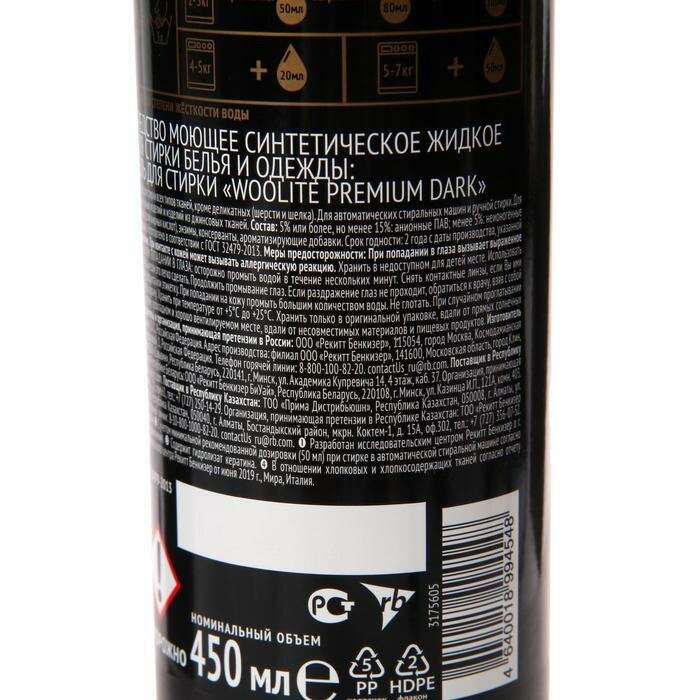 Гель для стирки Woolite Premium Dark, 0.45 л, бутылка