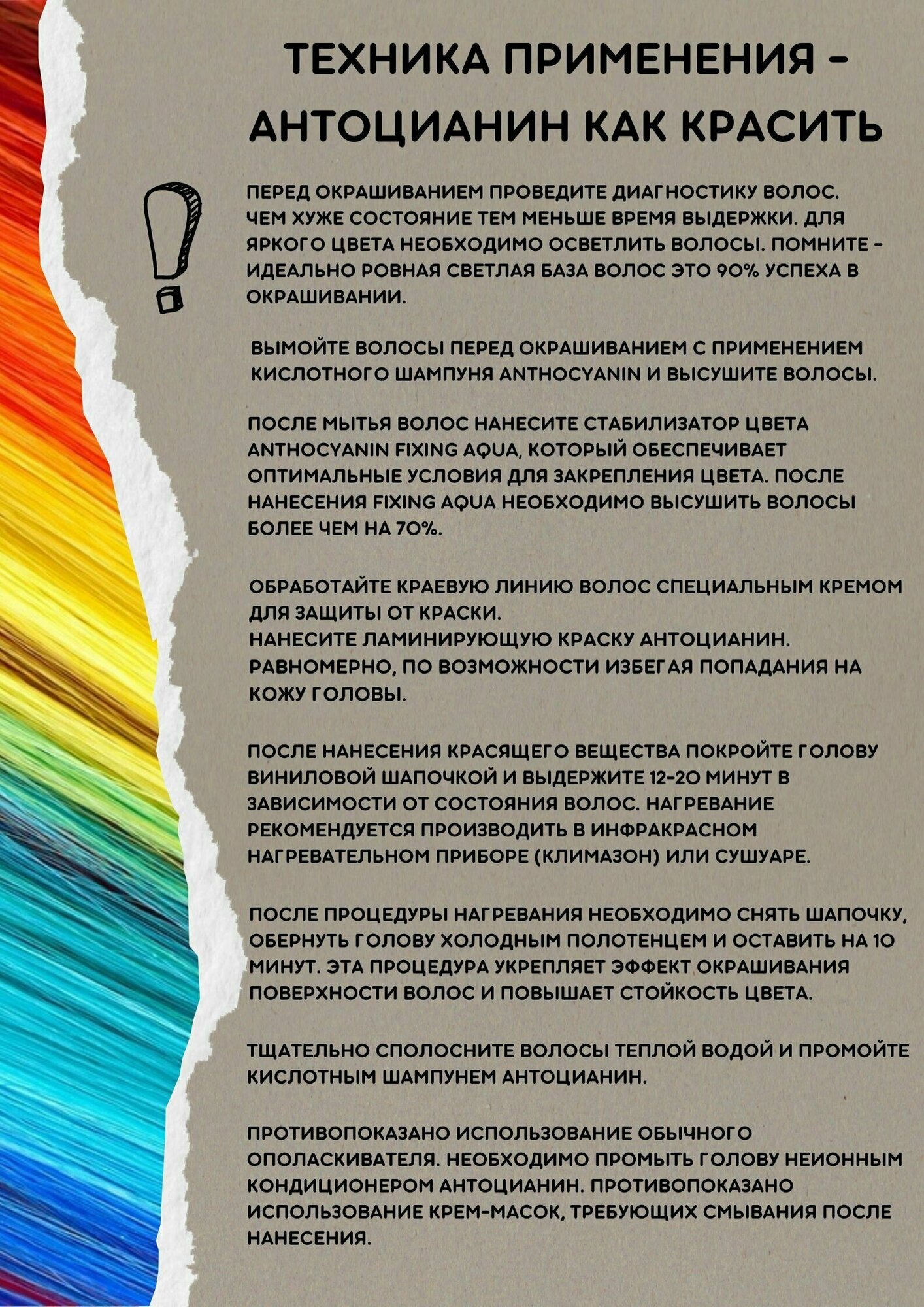 | Отзыв: | Не пользуйтесь какими-либо бальзамами и масками для волос за неделю до покраски антоцианином. Так краска возьмется лучше. |