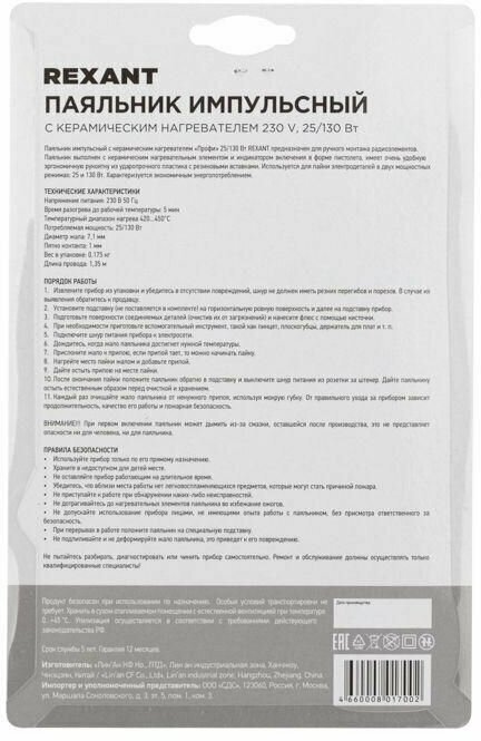 Паяльник импульсный REXANT с керамическим нагревателем «профи», 220 В/25-130 Вт