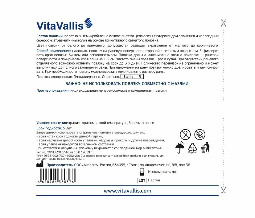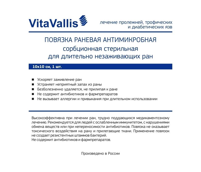 VitaVallis повязка раневая антимикробная сорбционная для длительно незаживающих ран. 10х10см. 1 шт. интересное: