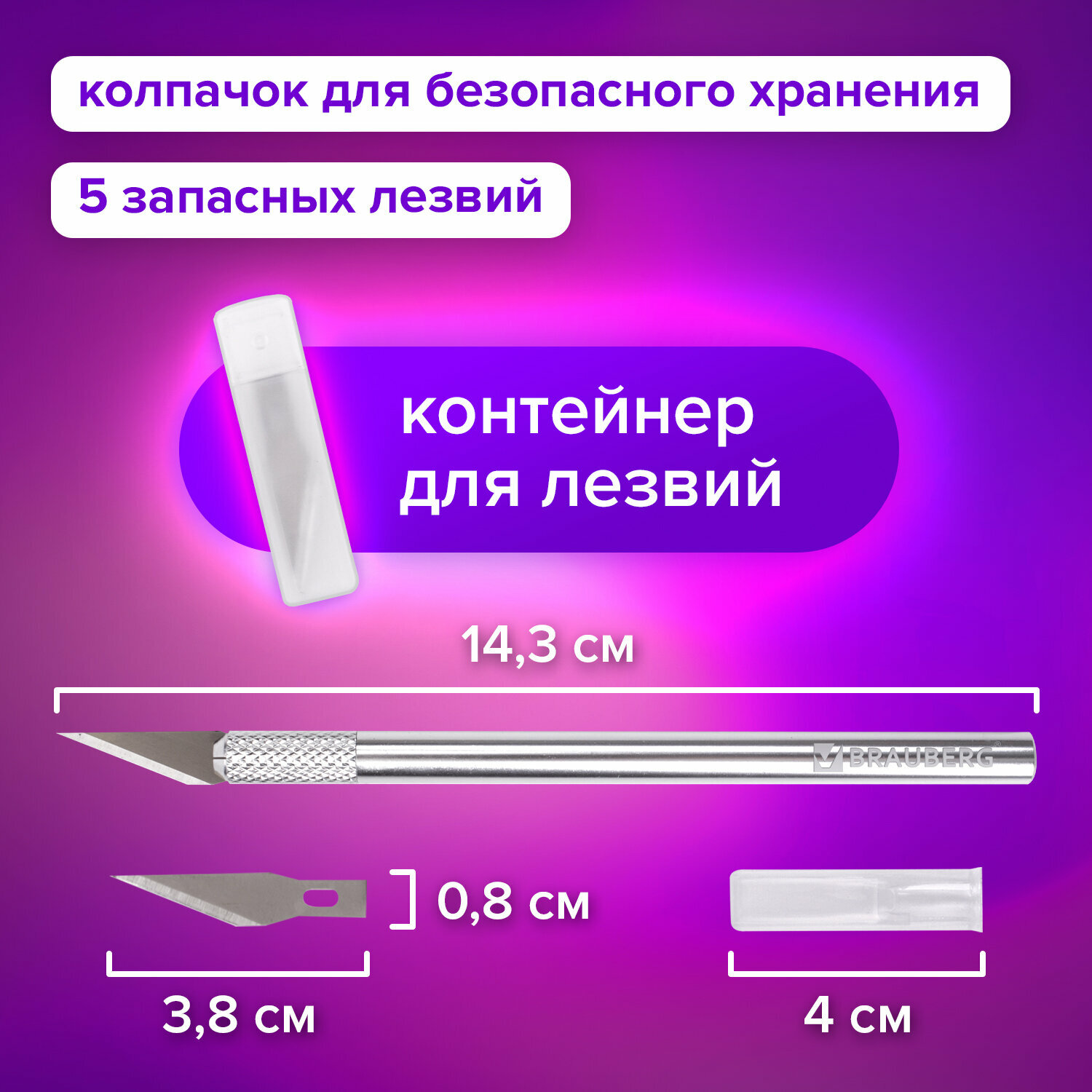 Нож-скальпель макетный BRAUBERG , металлический корпус, 5 лезвий в комплекте, блистер