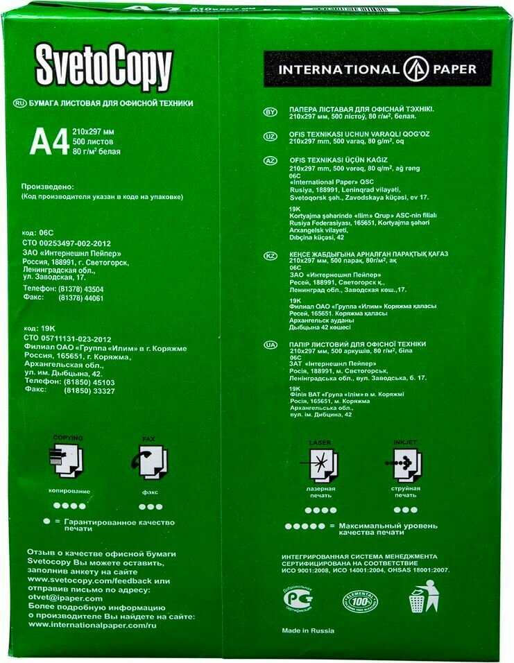 | Отзыв: | Хорошая бумага, в узнаваемой упаковке, так называемый офис-стандарт всея Руси. |