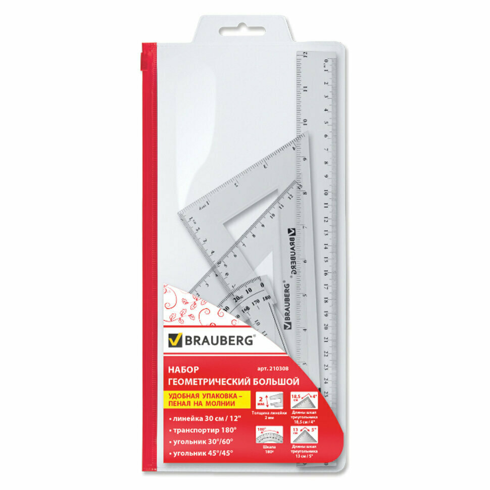 Набор чертежный большой BRAUBERG (линейка 30 см, 2 угольника, транспортир), конверт на молнии, подвес, 210308 Комплект : 3 шт.