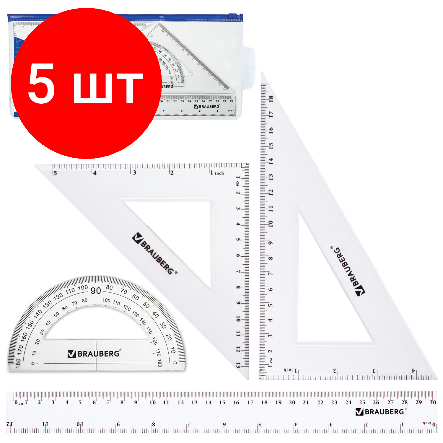 Комплект 5 шт, Набор чертежный большой BRAUBERG (линейка 30 см, 2 угольника, транспортир), конверт на молнии, подвес, 210308