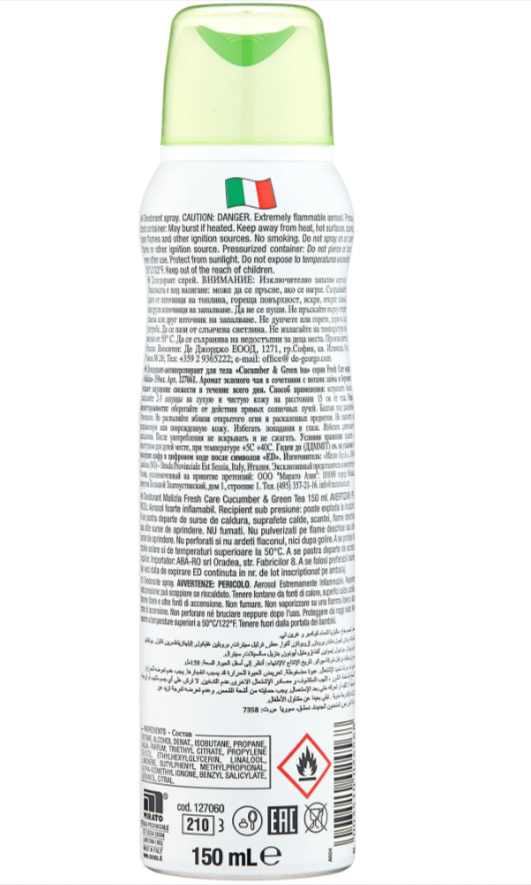 Ниже Вы можете прочитать отзывы на Дезодорант антиперспирант Malizia Fresh Care Cucumber Green tea 150 мл, ознакомится с подробными характеристиками, посмотреть интересные обзоры и фотографии на Дезодорант антиперспирант Malizia Fresh Care Cucumber Green tea 150 мл.