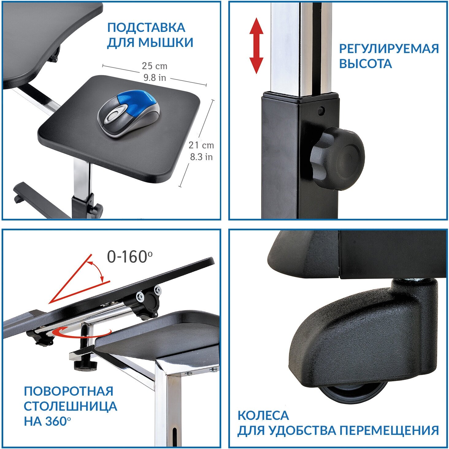функциональность стола (регулировка высоты, регулировка угла наклона основного стола, стол поворачивается на 360), с колесиками нижняя часть ножек достигает 7 см (как и указано в описании), стоит на это обратить внимание, колесики можно не устанавливать, устойчивость подставки от этого не страдает, а если нет необходимости катать по полу стол, то он вполне органично пролезает под небольшие предметы, около 4 см высотой. |