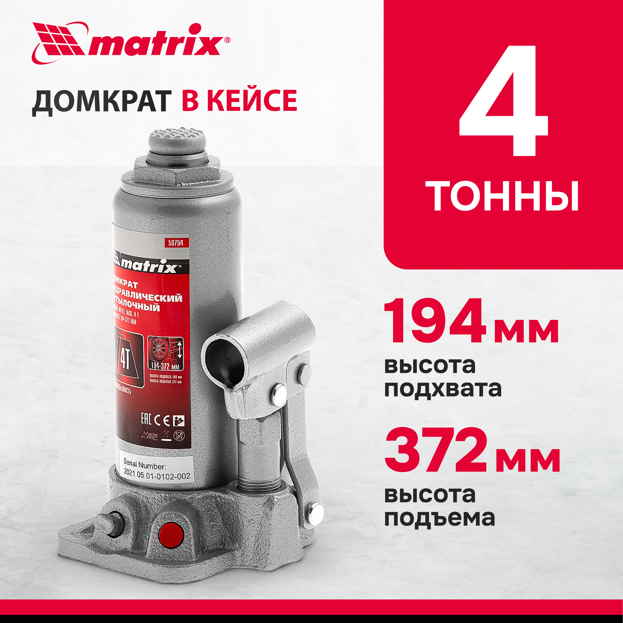 Купить MATRIX Домкрат гидравлический бутылочный, 4 т, высота подъема 194-372 мм, в пластиковый кейсе Matrix Master, ( 50754 )