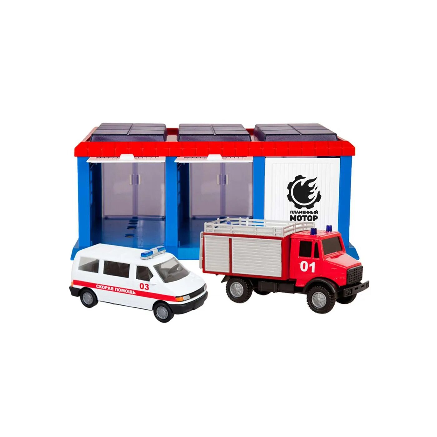 Гараж Служба спасения с пожарной и машиной скорой помощи Пламенный Мотор