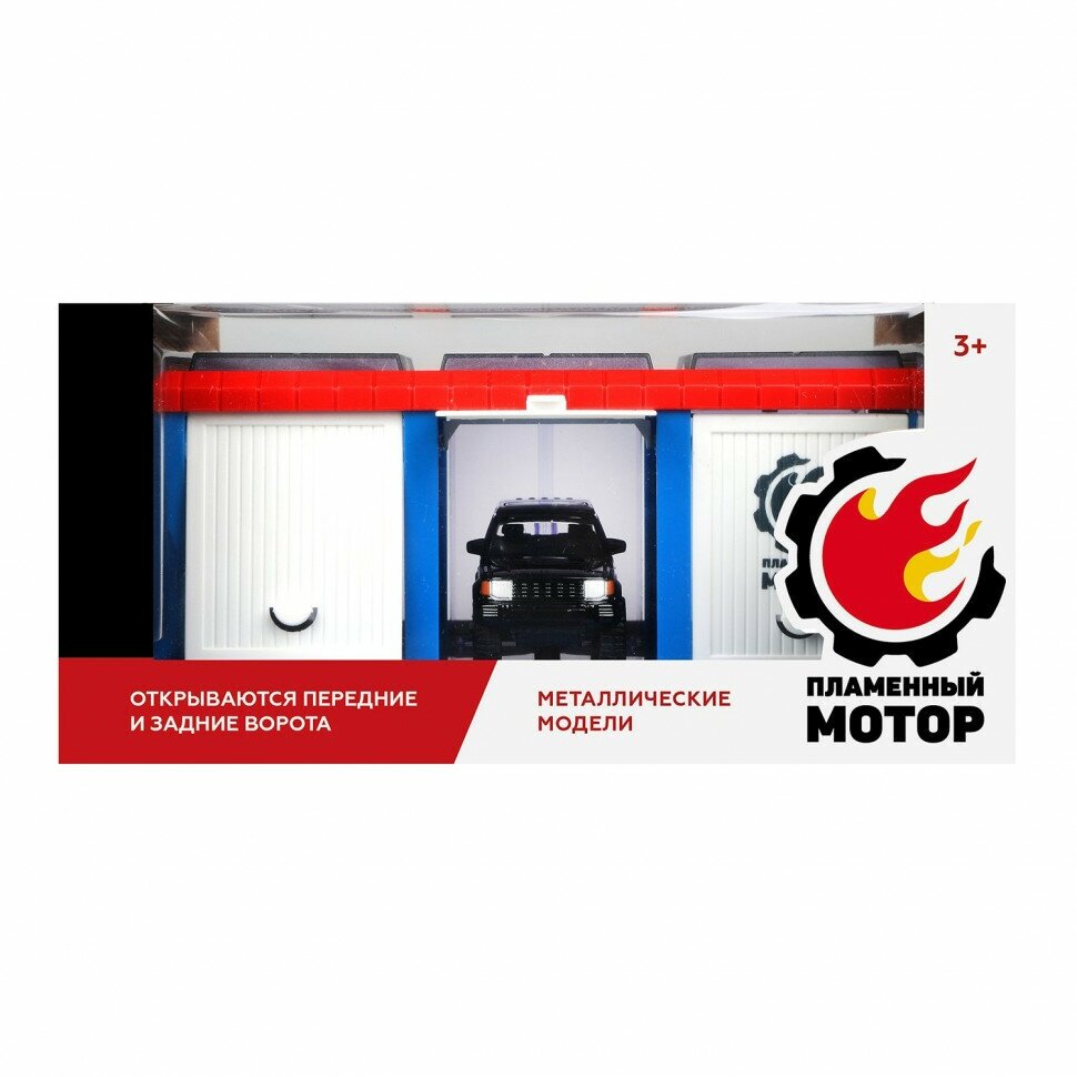 Гараж Пламенный мотор Город, открываются передние и задние ворота, джип металлический 1:43 (870271)