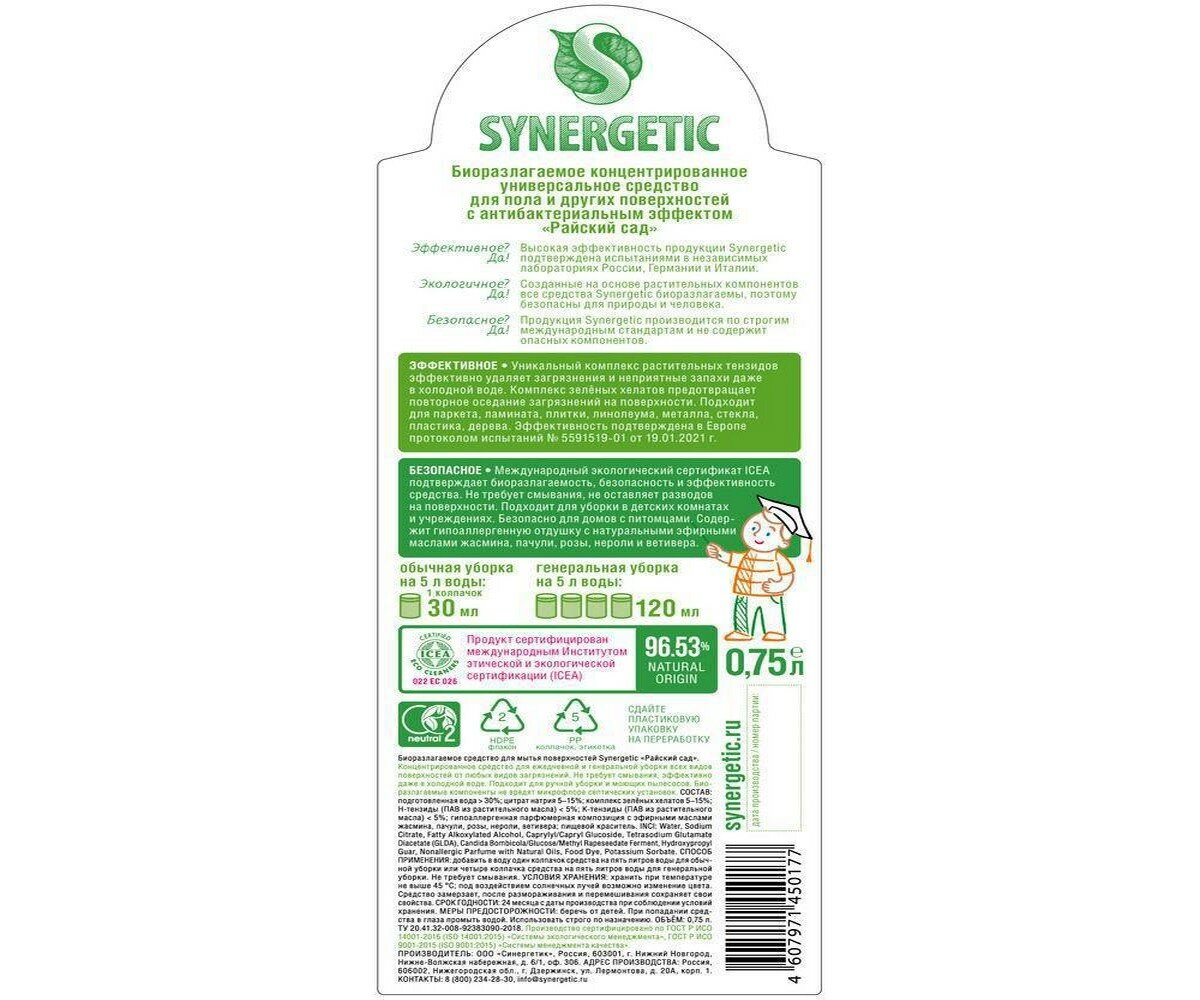 Synergetic Универсальное средство для мытья поверхностей (полы,стены и др) Райский сад, 750 мл