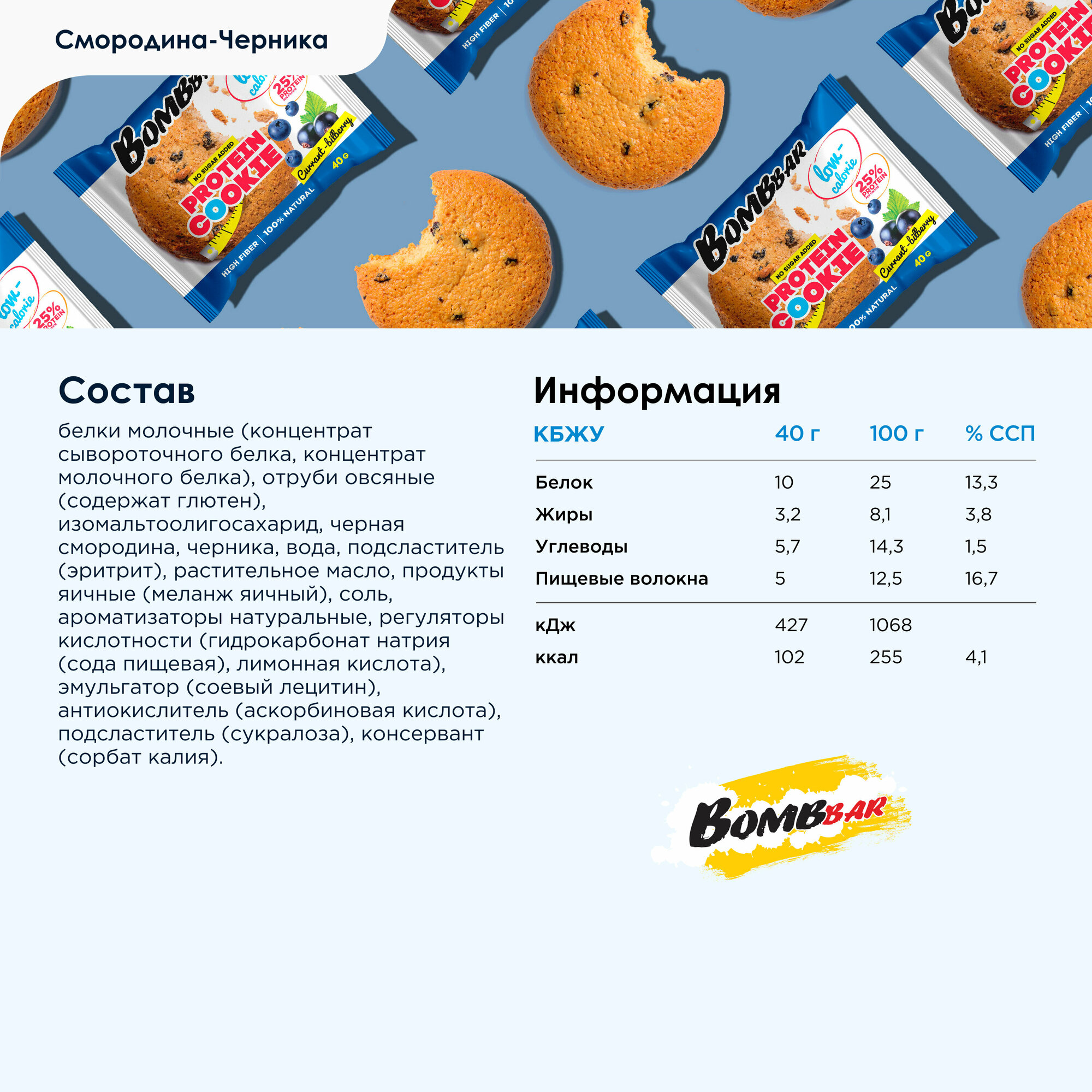 Протеиновое печенье низкокалорийное Bombbar Protein Cookie без сахара "Смородина - Черника", 12шт х 40г