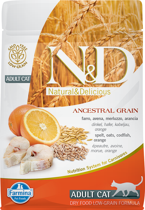FARMINA CAT N&D OCEAN CODFISH SPELT OATS & ORANGE низкозерновой для взрослых кошек с треской, спельтой, овсом и апельсином (1,5 кг)