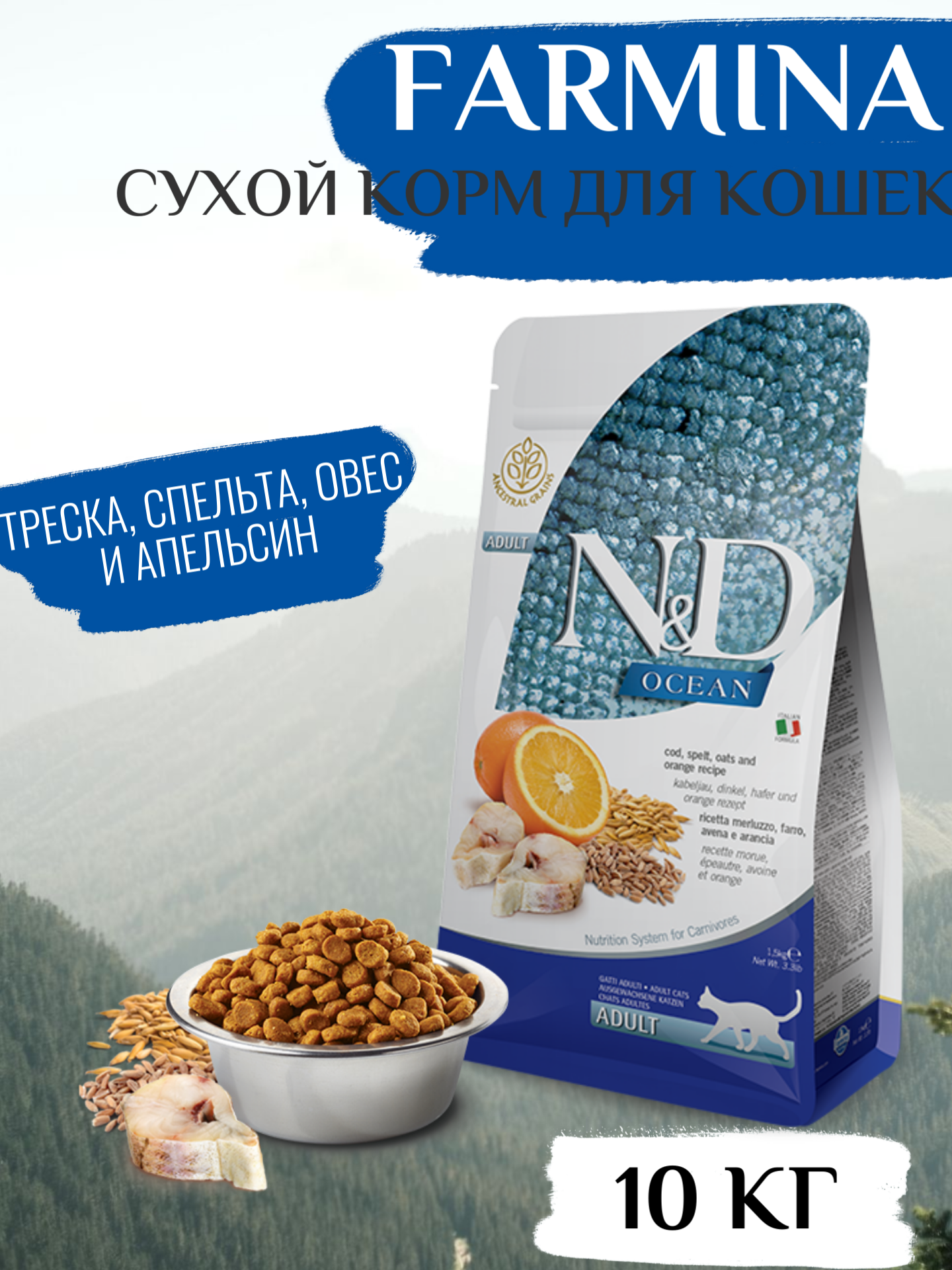 FARMINA N&D OCEAN корм д/кошек всех пород Треска, спельта, овес и апельсин 10кг