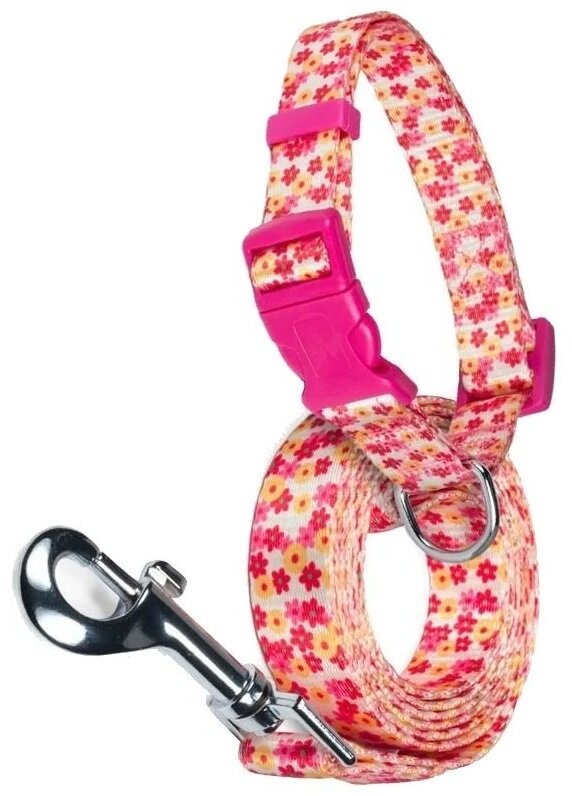 Комплект ошейник и поводок нейлоновый "Цветочки" S, 15*260-400мм; 15*1200мм 4680384016109