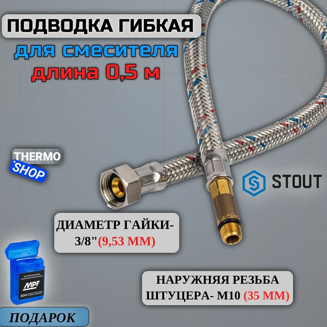 Гибкая подводка для смесителя для воды M 10 (35мм) х ВР 3/8, длина 500 мм Нить сантехническая
