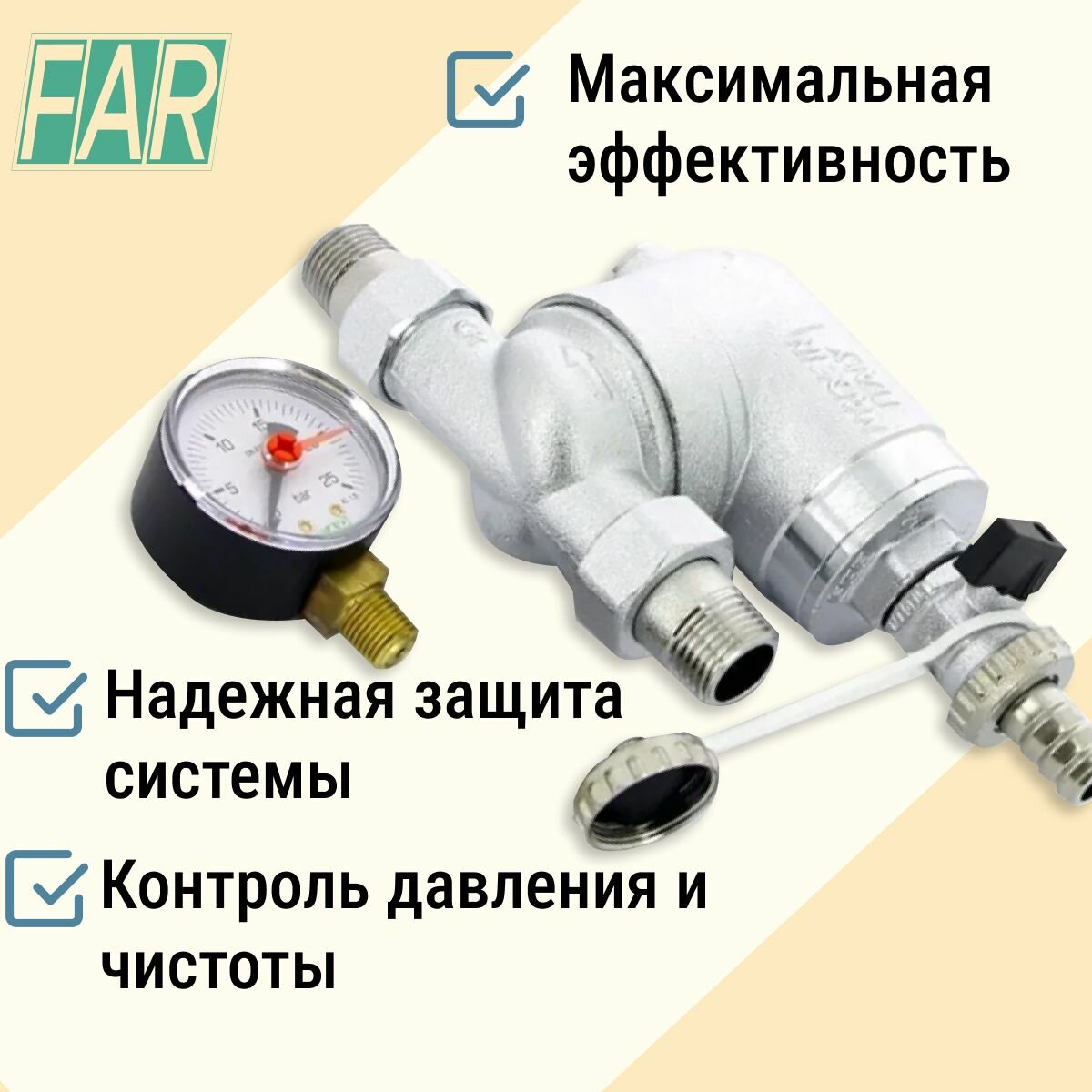 Far Фильтр 3/4" НР-НР с манометром, поворотное соединение, 100 мкм, хромированный