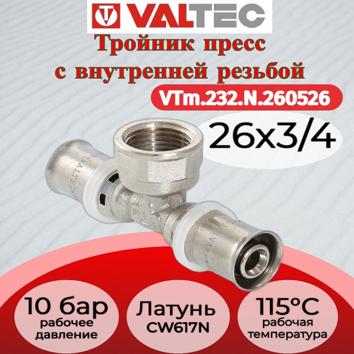 Тройник пресс с переходом на вн. р. 26х3/4"х26 | код. VTm.232.N.260526 | VALTEC ( 1шт. )