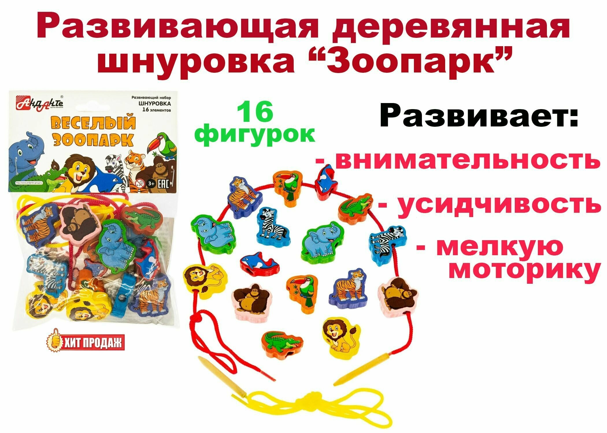 Анданте Деревянная шнуровка бусы Веселый зоопарк 16 эл (Д001а) 18576 интересное: