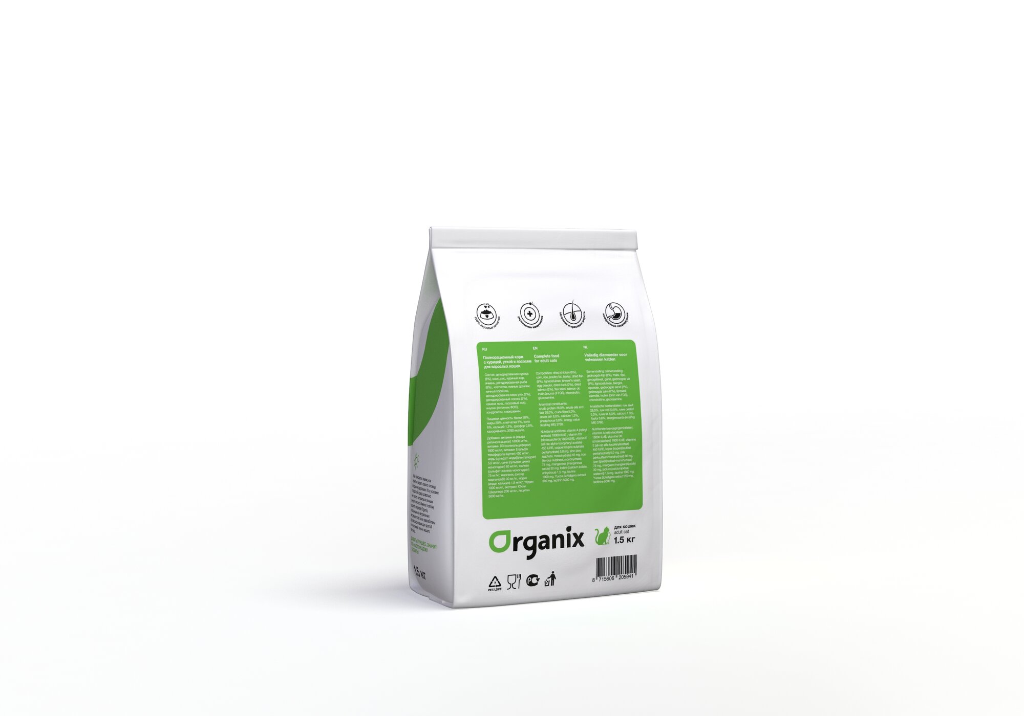 Сухой корм для кошек ORGANIX для здоровья кожи и блеска шерсти, с курицей, с уткой, с лососем 1.5 кг