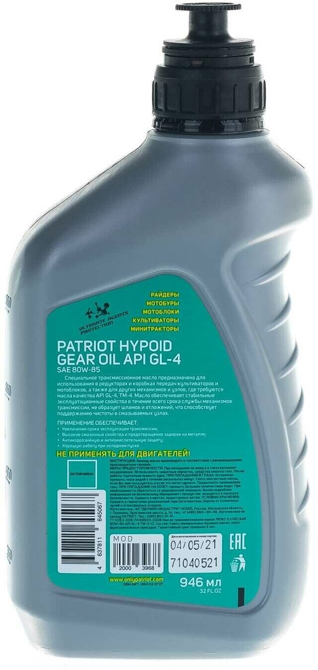 PATRIOT Масло трансмиссионное Hypoid API GL-4 80W85 0,946 л 850030727 интересное: