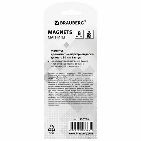 Магниты диаметром 30 мм, комплект 8 штук, цвет ассорти, в блистере, BRAUBERG, 230758 Комплект : 1 шт .