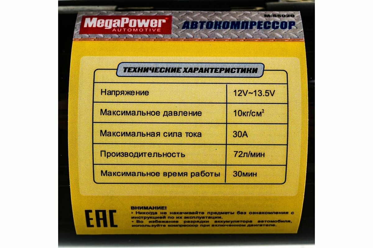 MEGAPOWER-AUTOMOTIVE M-55020 Компрессор автомобильный 72л/мин. 10атм. 30А 12V на клеммы АКБ MEGAPOWER