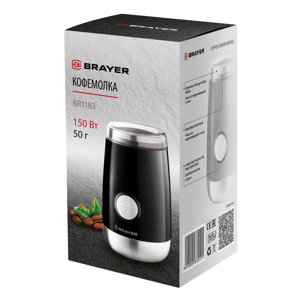 Кофемолка BRAYER BR1183, емкость 50 г., 150 Вт, пластиковый корпус, чаша из нержавеющей стали