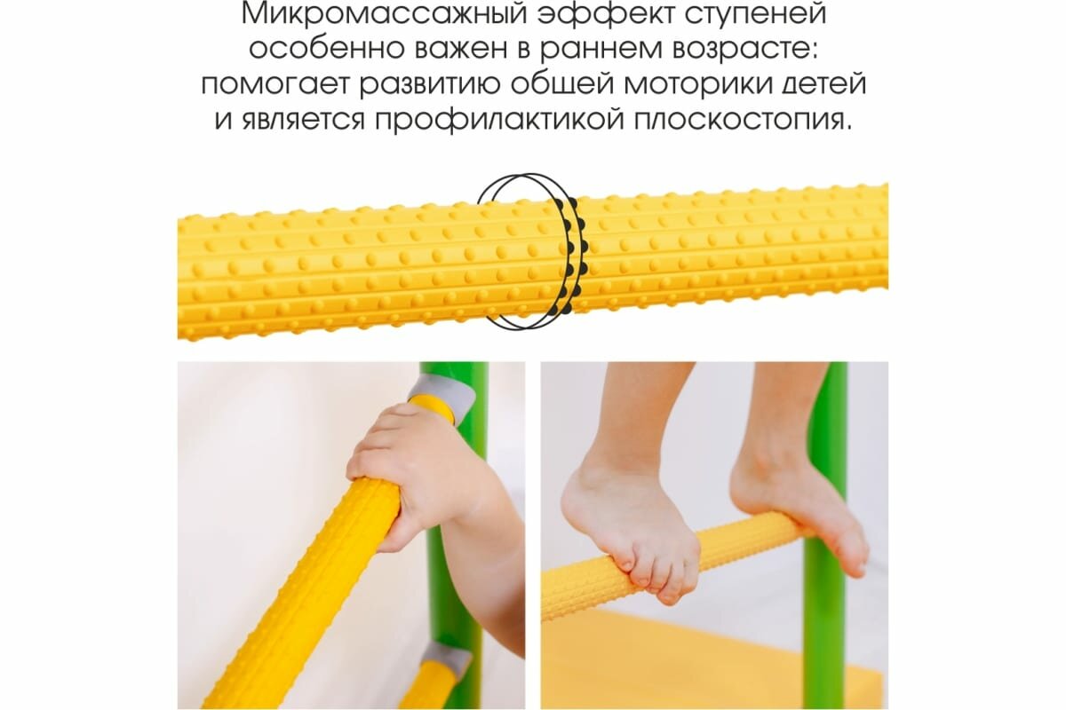 | Отзыв: | Хороший, прочный металл. Смотрится красиво. Массажное покрытие - это +. Удачная расцветка. Занимаемся всей семьей. Детям нравится. Ребенок в 1,5 года сам поднимается и спускается. |