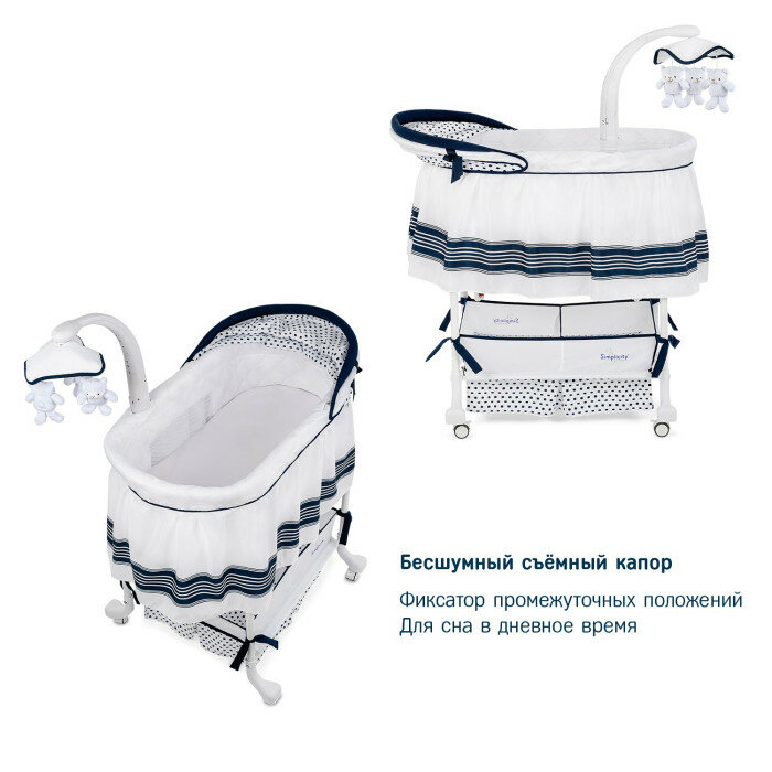 | Плюсы: | Адекватная цена. Колыбель просторная и с высокими бортиками, от сквозняков хорошо защищает ребенка. Хорошая комплектация, есть качественный музыкальный мобиль с игрушками, неплохой матрасик и простынка. |