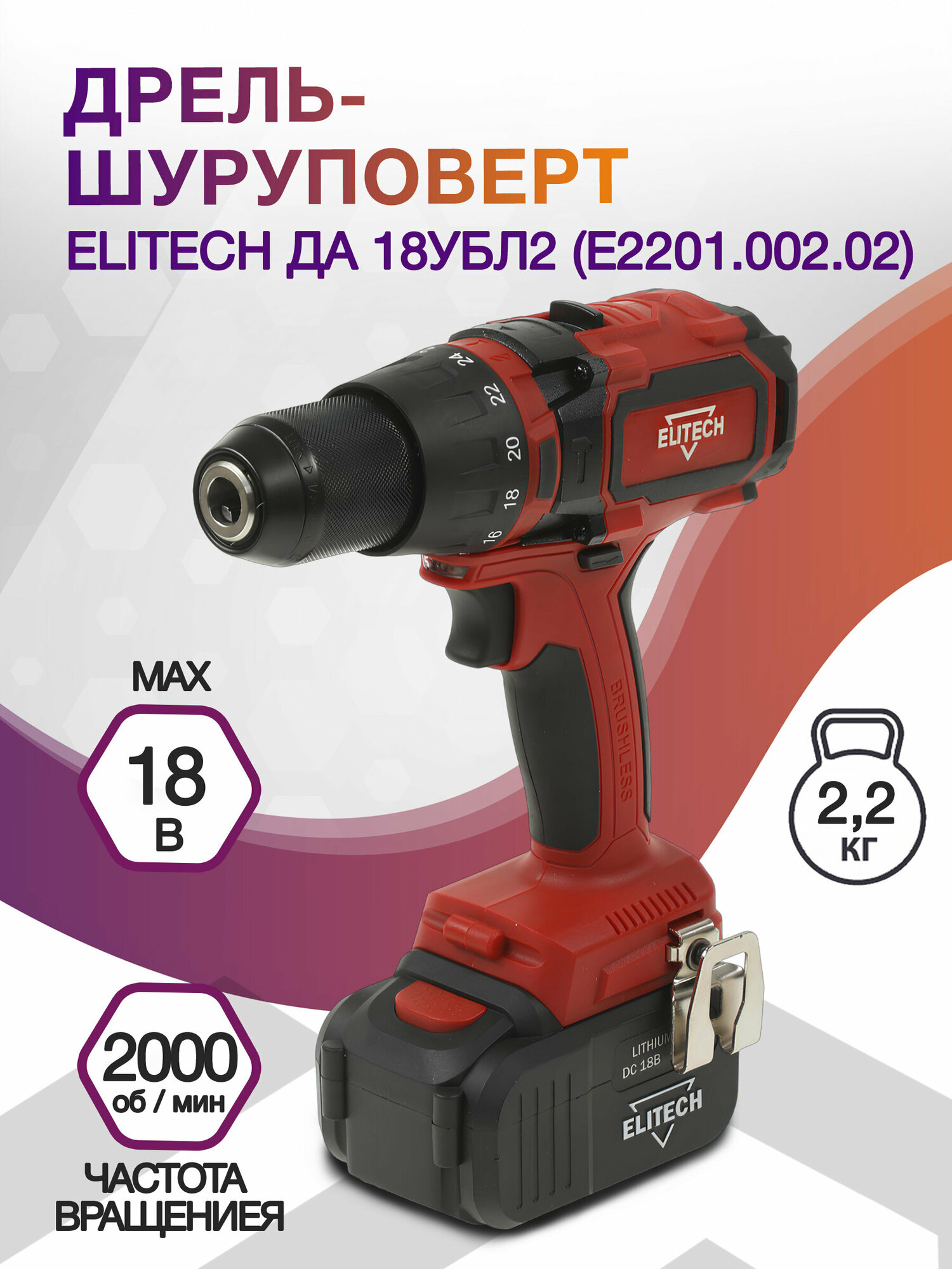 Аккумуляторная дрель-шуруповерт Elitech ДА 18УБЛ2 (Е2201.002.02) (191609)