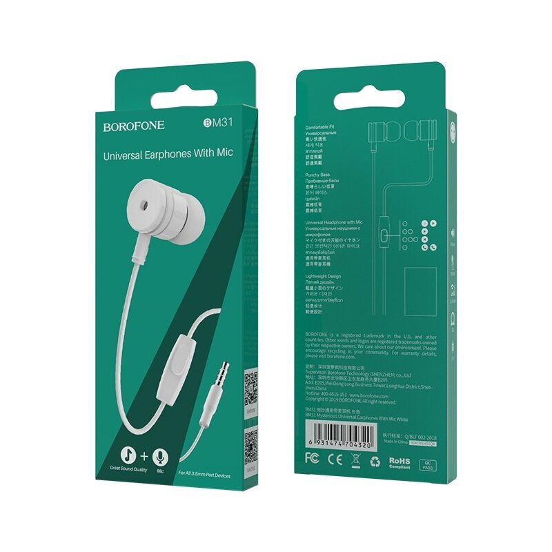 Проводные наушники BOROFONE BM31 Mysterious, Jack 3.5mm, 1.2 м, белый