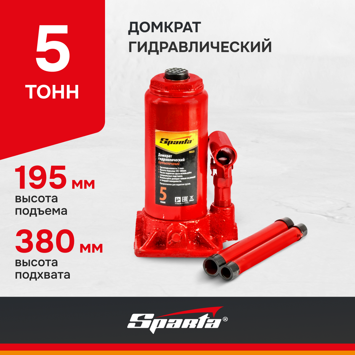Домкрат гидравлический бутылочный, 5 т, h подъема 195-380 мм Sparta ( 50323 )