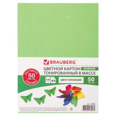 Картон цветной А4 тонированный В массе, 50 листов, зеленый, 220 г/м2, BRAUBERG, 210х297 мм, 128984, 128984
