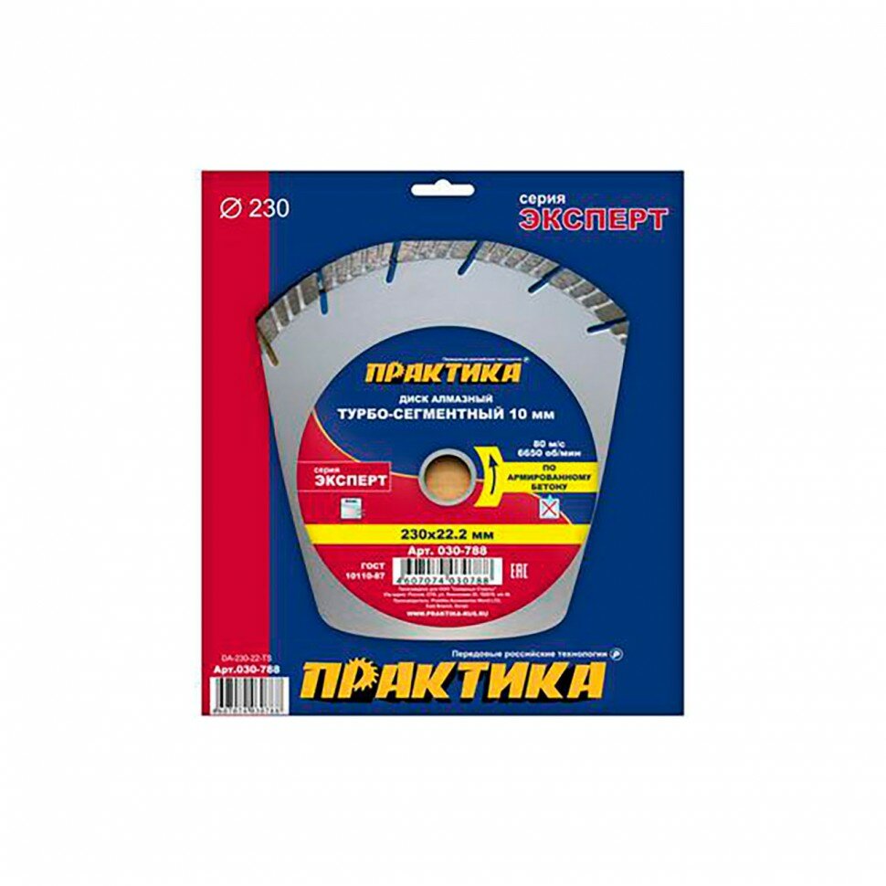 Диск алмазный турбосегментный ПРАКТИКА "Эксперт-бетон" 230 х 22 мм, сегмент 10мм (1 шт.) коробка ("Эксперт-бетон", 230х22мм, сегмент 10мм, коробка)