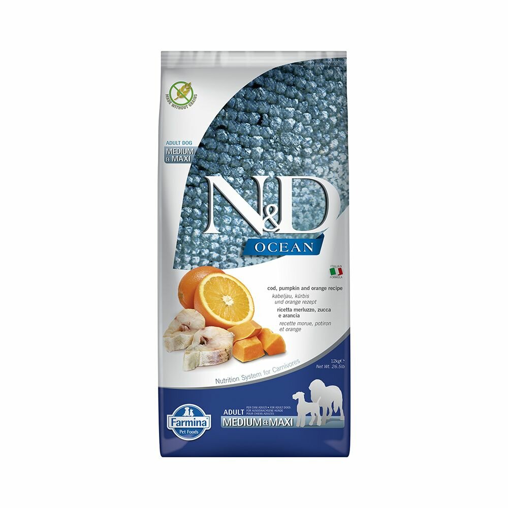 FARMINA DOG N&D OCEAN ADULT MEDIUM & MAXI CODFISH PUMPKIN & ORANGE беззерновой для взрослых собак средних и крупных пород с треской, тыквой и апельсином (12 кг)