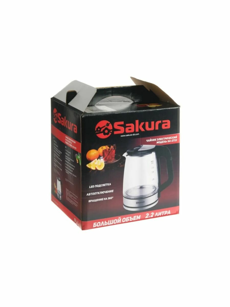 Чайник электрический Sakura SA-2722BK, стекло, 2.2 л, 1800 Вт, подсветка, серебристо-чёрный