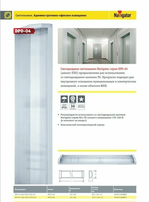 Светильник 61 299 DPO-04-1200-IP20-2хT8-G13 ( ЛПО 2х36) без ламп Navigator 61299 61299 .
