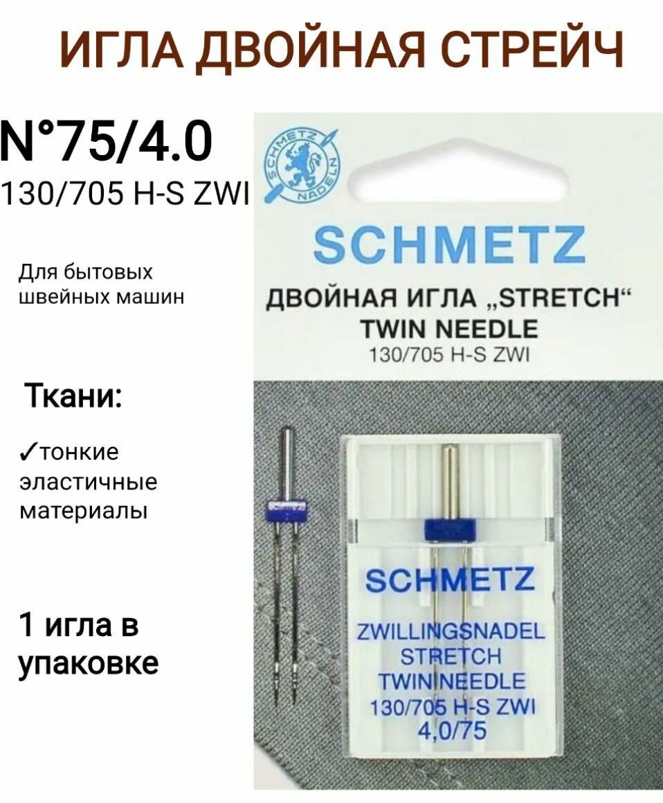 Швейные иглы стрейч двойные № 75/4.0, 1 штука, Schmetz 130/705Н-S ZWI для швейных машин