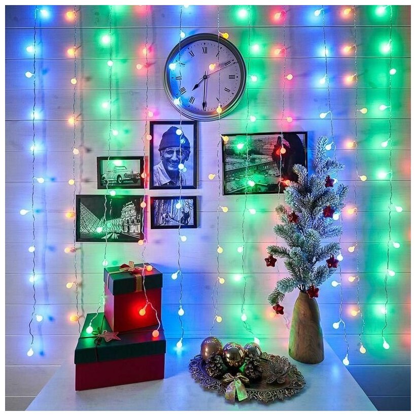 Светодиодная гирлянда Neon-night "Дождь" с насадками в виде шаров, 1.5х1.5 м, 8 режимов, 144 разноцветных светодиодов, прозрачный провод