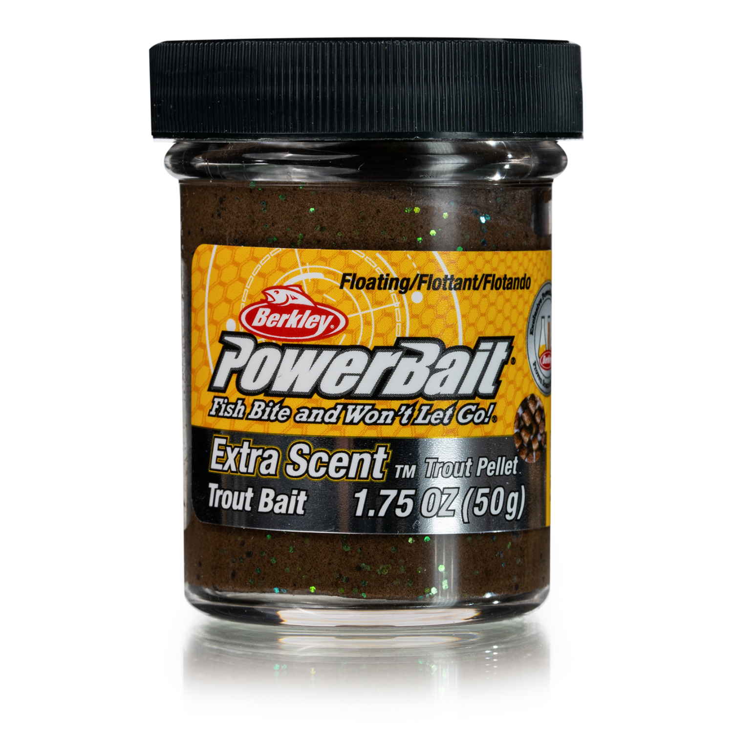 Паста прессованная прикормка Berkley PowerBait Extra Scent Glitter Trout Bait, 50 г, черно-оранжевый с блестками