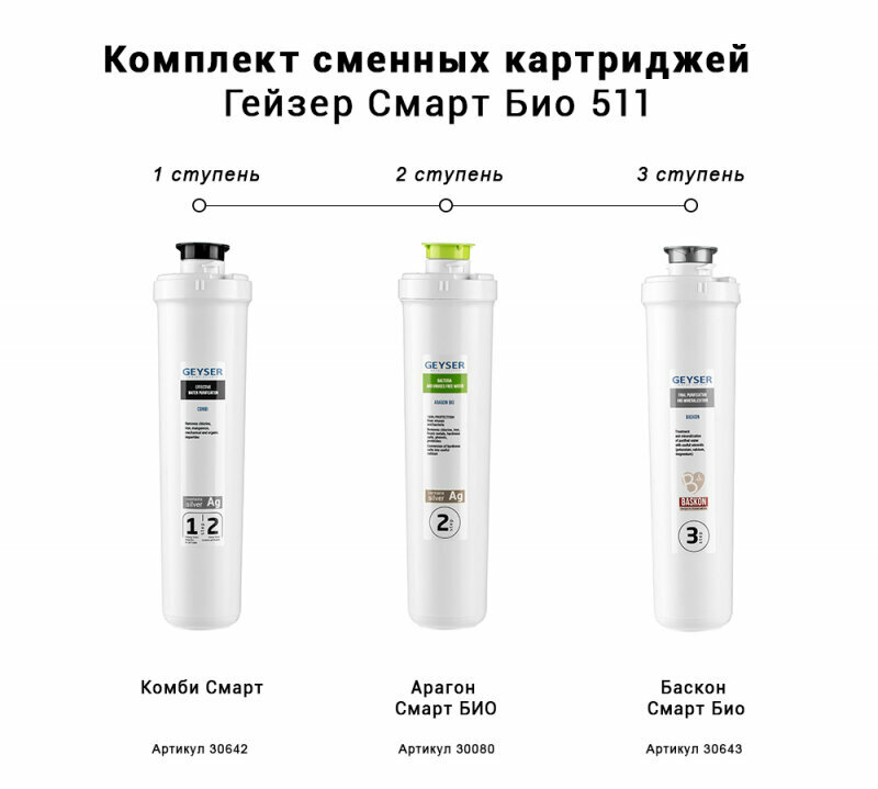 Комплект картриджей Гейзер Смарт Био 511, для мягкой воды, 100% удаление бактерий и вирусов, уникальная технология очистки и минерализации, 50103
