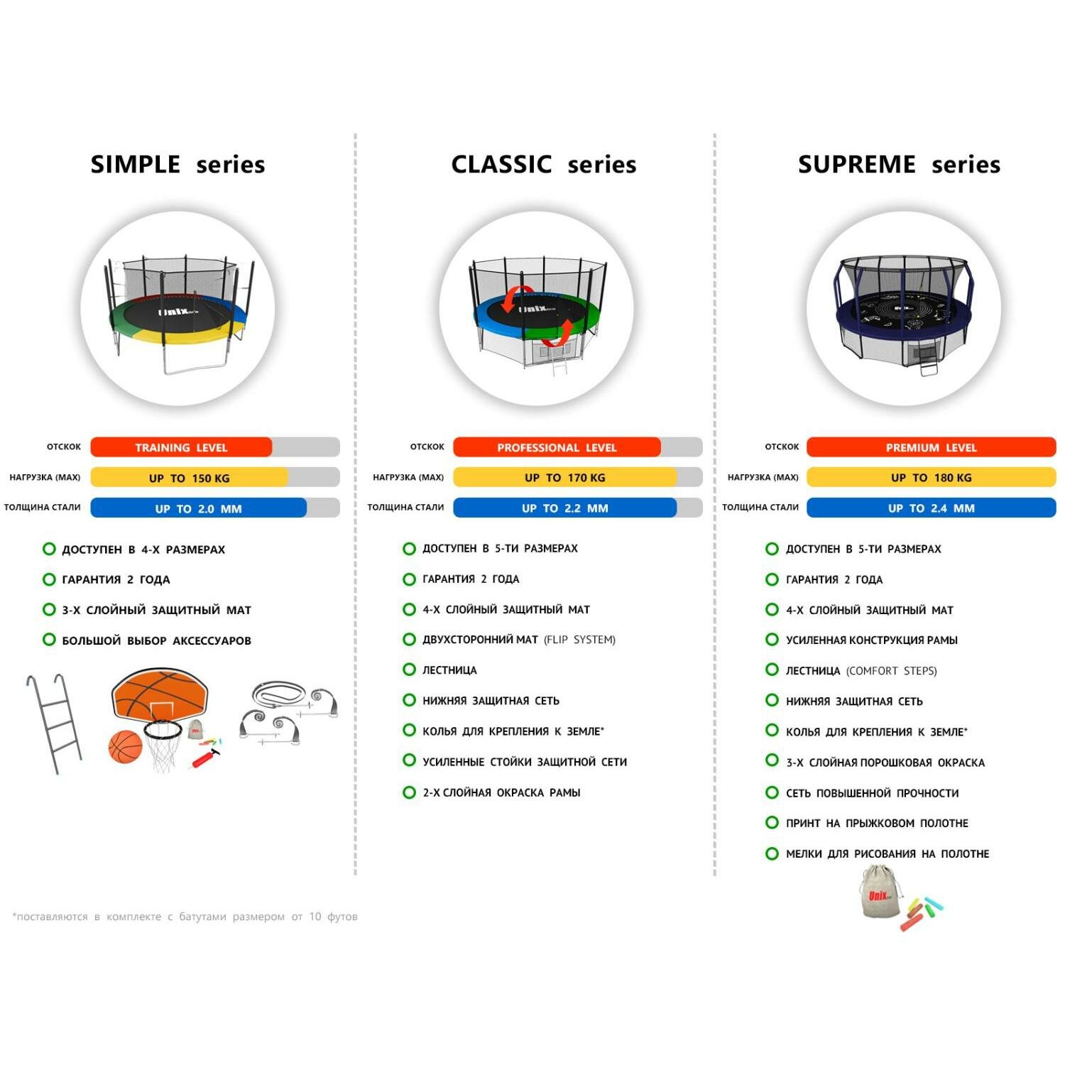 | Плюсы: | Модель батута Unix Line 12ft Simple (inside) идеально подойдёт тем, у кого большая семья. На такой диаметр поместилось много детей. Модель хороша тем, что поставляется с защитной сеткой, которая расположена по всему батуту. Также она высокая и прочная. Каркас выдерживает вес 150 кг. Установили батут быстро и легко. Хочу отметить высокое качество прыжкового полотна и защитного мата. Все детали на месте. Весь прошлый сезон батут стоял в огороде ничего не сломалось и не заржавело, хотя было много дождей и других осадков. Батут порадовал! |