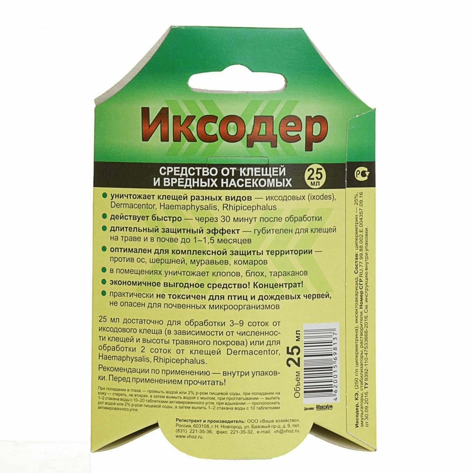 Иксодер 25мл. От клещей/муравьев/тараканов/блох/клопов (обраб. террит.) циперметрин Ваше Хозяйство (арт. 729755)
