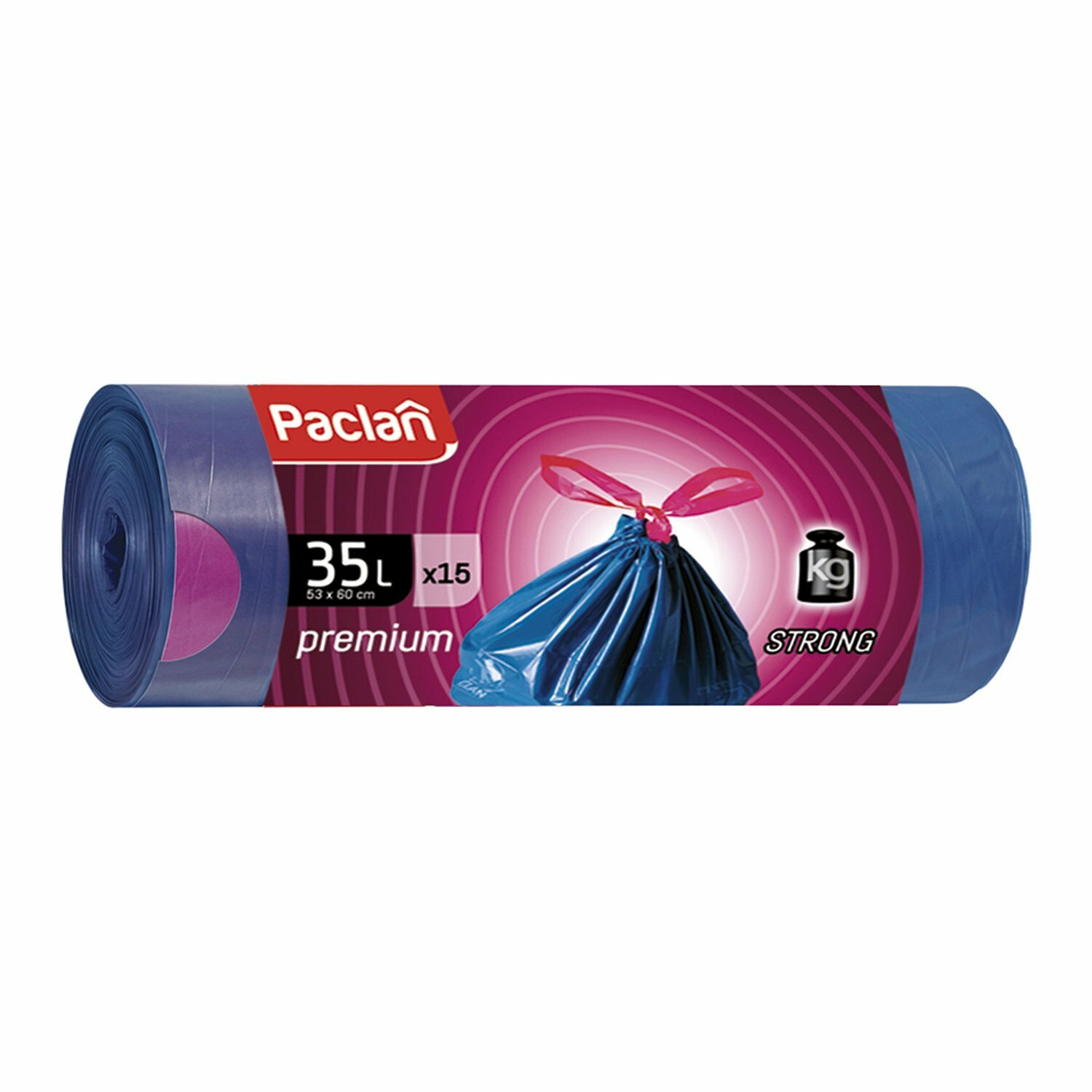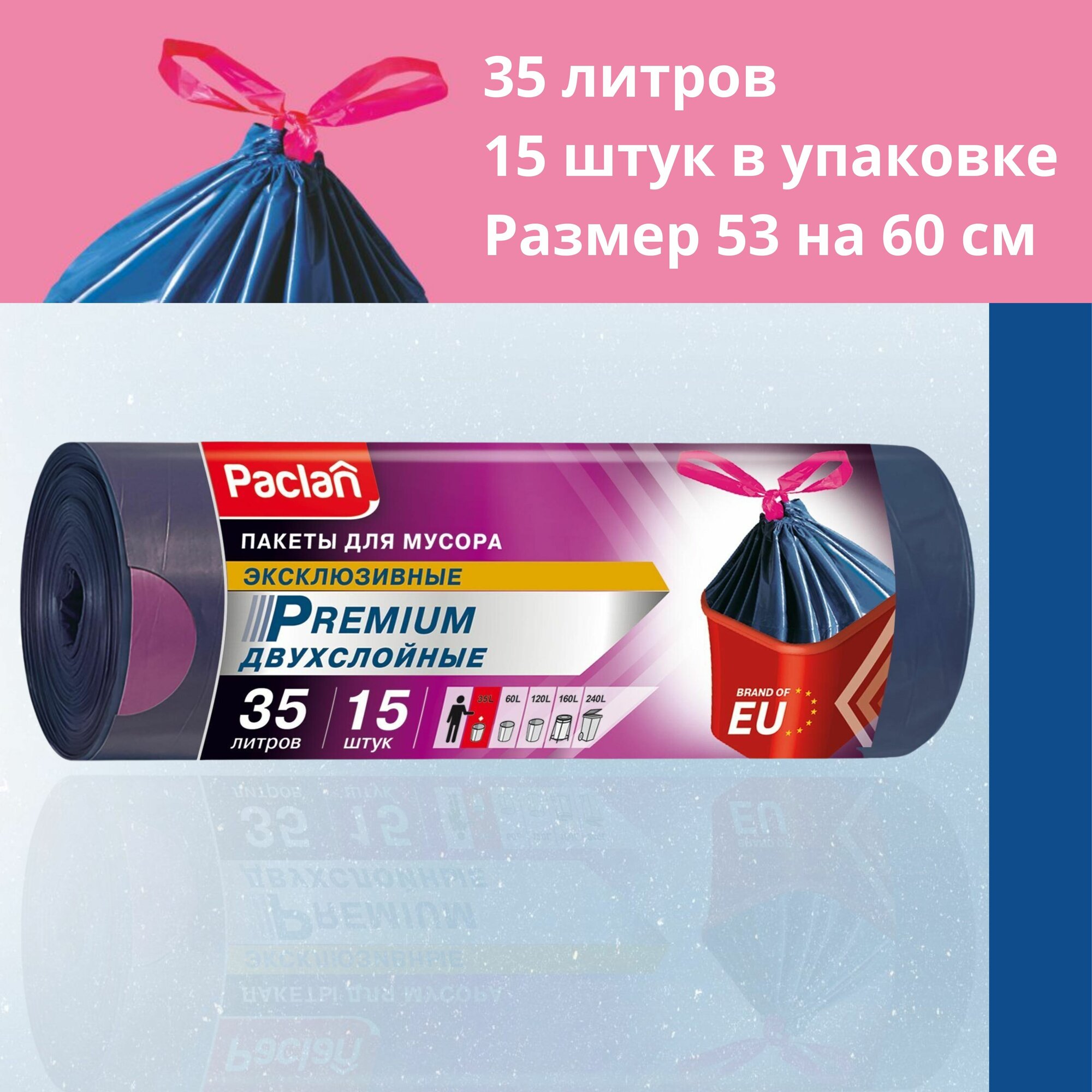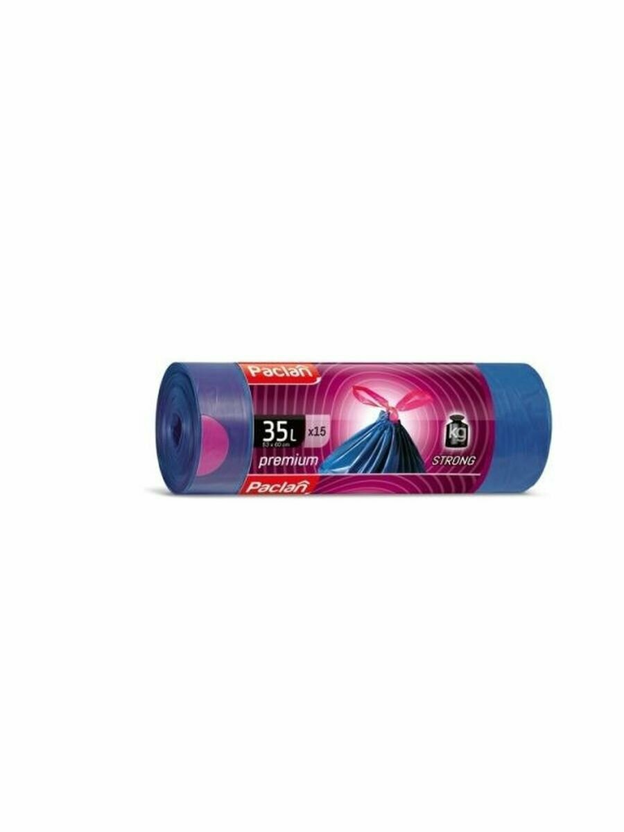 Мешки для мусора PACLAN 35 л, завязки, синие, в рулоне 15 шт, полиэтилен, 60х53 см, "Premium" (402170)