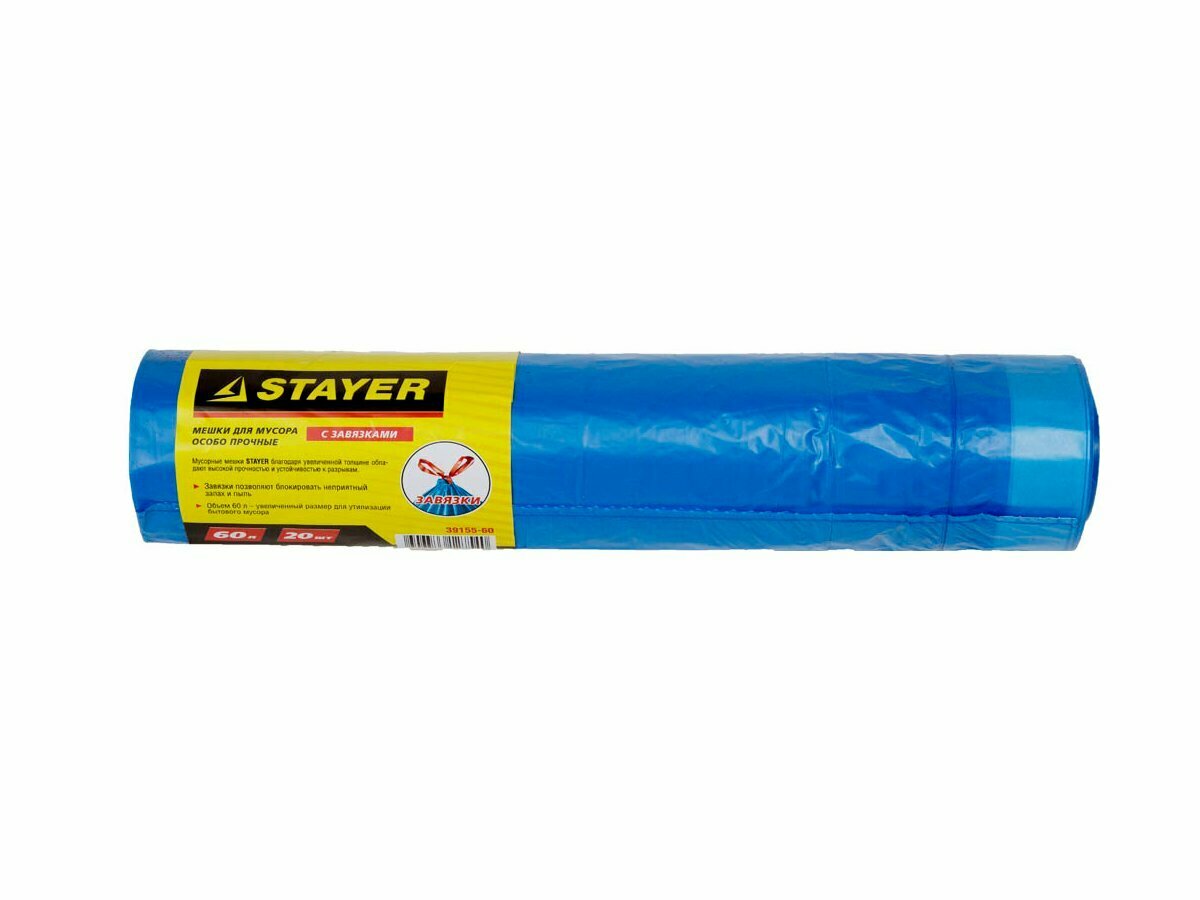 Stayer 60 л, 20 шт, синие, особопрочные, с завязками, мусорные мешки (39155-60)