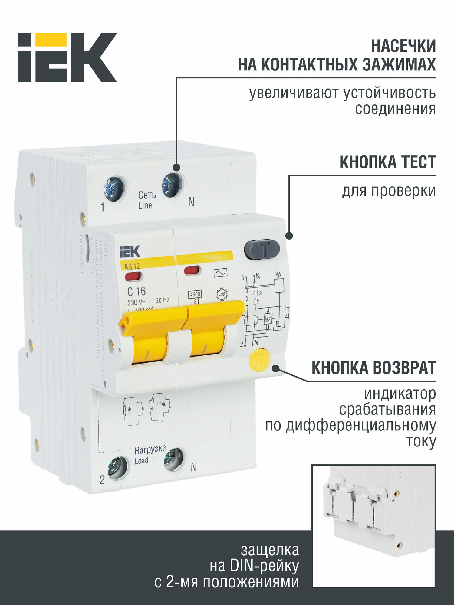 MAD10-2-016-C-100 Дифференциальный автоматический выключатель IEK АД12 2П 16А 100мА, тип AC, 4.5кА, C