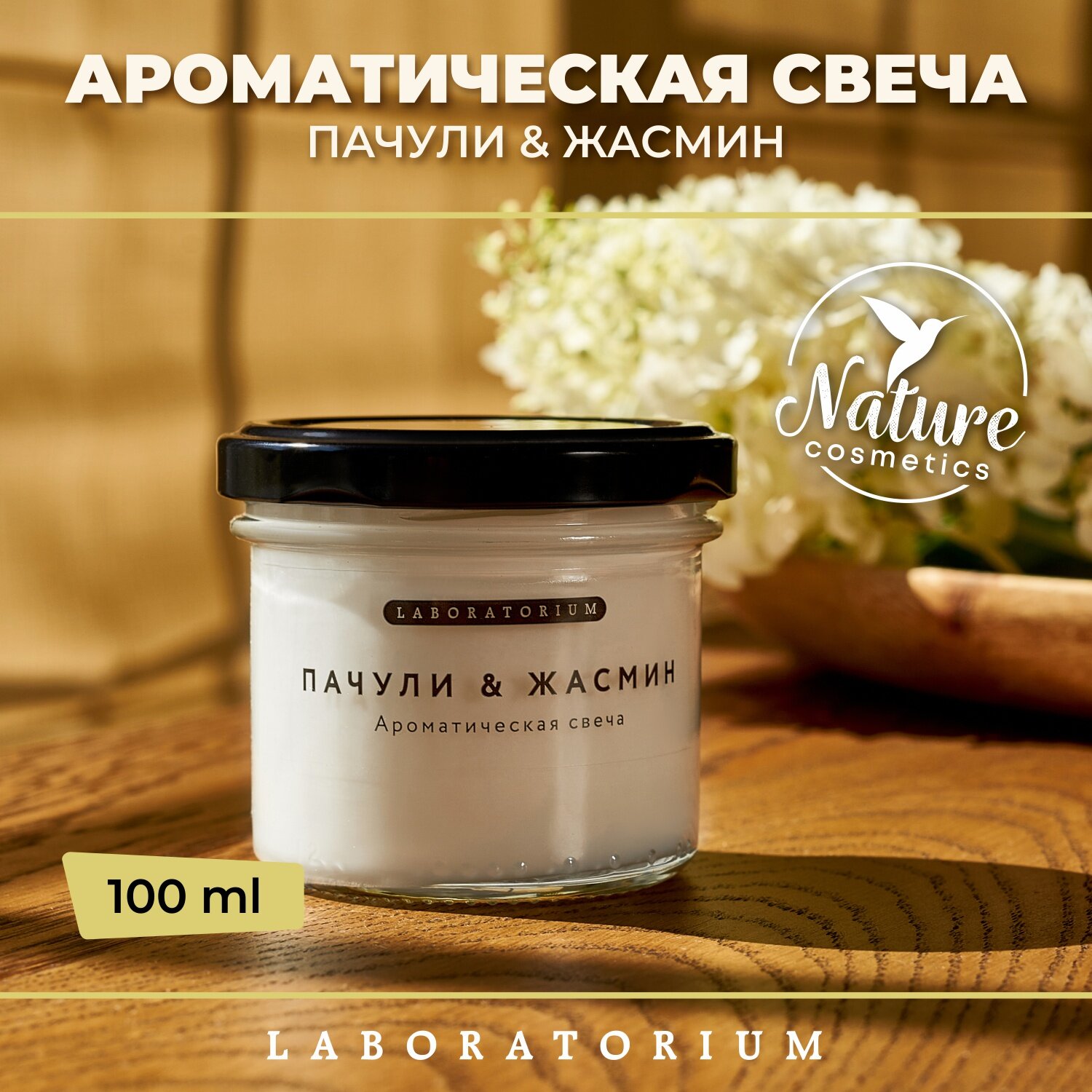 Laboratorium Ароматическая свеча Пачули Жасмин "Цветочный, травяной, древесный", 11,7 см х 8,7 см, 1 шт, 100мл